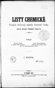 “On October 1, 1876, the first issue of Listy chemické was published, and the originally single-printing-sheet monthly issues soon switched to a two-sheet format due to considerable interest and the amount of editorial material. The journal is edited by Karel Preis.”