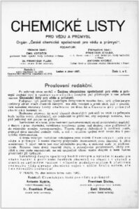 Chemické listy – Listy chemické was not the first purely chemical journal in the Czech lands, which was undoubtedly the Časopis chemiků českých (Journal of Czech Chemists) [2]. As was written in its first issue by the “Editors”, it seemed appropriate to add a chemical journal to the Czech scientific journals as early as 1868.