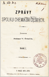 Nonetheless, the torch was not extinguished; it was picked up by another hand. As early as 1872, Vojtěch Šafařík, a member of the editorial board of the aforementioned journal Časopis chemiků českých, began publishing the Zprávy Spolku chemikův českých (Reports of the Association of Czech Chemists; printed by Dr. J. Pichl & Co.) at his own expense. Šafařík also touched on the history of Czech chemical literature in the introduction. He praised the idea of founding the Journal of Czech Chemists, saying that chemistry teachers have a difficult situation with teaching in Czech and that he hoped that it would make clear the need for publishing a regular chemical journal.