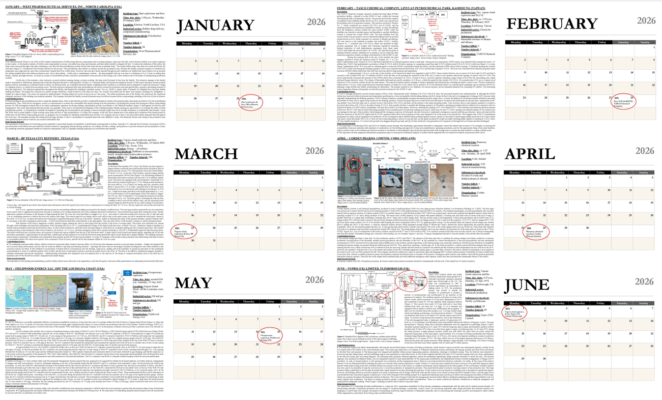 In light of this, Peter Davern (a lecturer in the Department of Chemical Sciences, University of Limerick, Ireland) has created a 2026 Calendar of Process Safety Incident Case Studies (PDF file) as a recurrent, i.e., monthly, learning opportunity in process safety awareness for anyone who hangs up the calendar at their desk, or on the noticeboard in their shared office workspace, break room, control room, maintenance workshop, boardroom, or corner office.