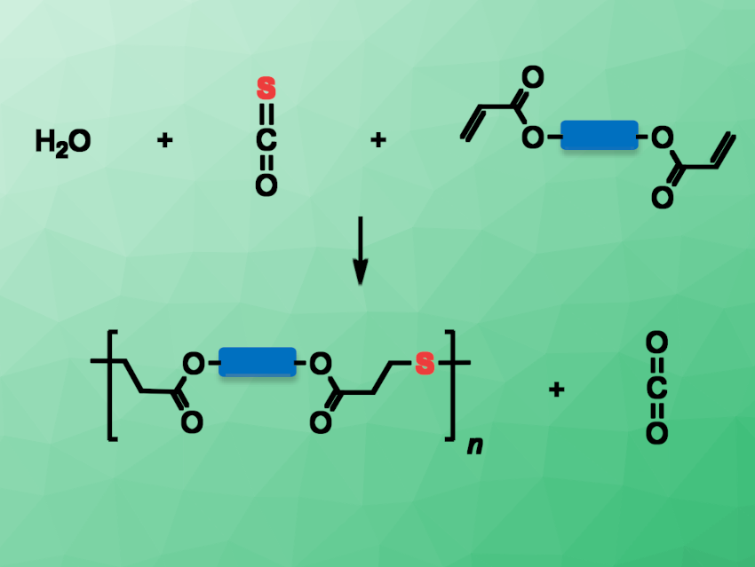Xinghong Zhang, Zhejiang University, Hangzhou, China, and colleagues have developed a series of chemically recyclable polymers using the first reported cascade polymerization of H2O, COS, and diacrylates (overall reaction pictured). The team used a variety of commercially available organic or inorganic bases, such as guanidines, amidines, amines, alkali metal alkoxides, hydroxides, or carbonates, as the catalyst. Sixteen different diacrylates were employed as substrates. The reactions were performed in air and solvent-free at 60 °C over 4 h.