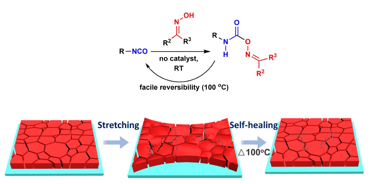 Xiaotian Hu, Nanchang University, China, Fengyu Li, Jinan University, Guangzhou, China, Yiwang Chen, Nanchang University and Jiangxi Normal University, both Nanchang, China, and colleagues have tackled this problem. The researchers prepared stretchable PSCs using a self-healing polyurethane (s-PU). The s-PU was synthesized by a polyaddition of multifunctional oximes and hexamethylene diisocyanate at ambient temperature. The resulting material has reversible covalent oxime–carbamate bonds (pictured below). It was introduced as a scaffold into the perovskite crystallization process. Perovskite films produced in this way have an enhanced grain size and improved crystallinity. The perovskite films (pictured below in red) were coated onto a stretchable polydimethylsiloxane substrate (pictured below in cyan).