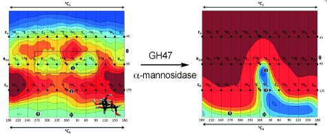 The six-membered pyran ring of the mannopyranose units of N-glycans exists in solution in a variety of conformations, ranging from chairs and boats to several distorted conformations with skew or half-chair forms. From X-ray structures of the mannosidase with a substrate analogue, the researchers have found that, upon binding to the enzyme, the mannose unit takes on a distinct distorted conformation with a skew form. This is largely supported by the coordination of two hydroxy groups of the mannose unit by the essential calcium ion.