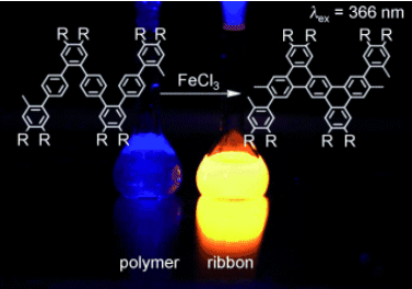 Polymeric polyphenylene precursors were prepared by using microwave-assisted Suzuki-polycondensation, and were then converted into the corresponding graphene nanoribbons by a multiple Scholl reaction using FeCl3 (see reaction scheme in figure). The structure of these nanoribbons was confirmed by NMR spectroscopy and MALDI-TOF mass spectrometry, while other precursors showed a red shift of the emission maximum in the UV/Vis and photoluminescence spectroscopy.